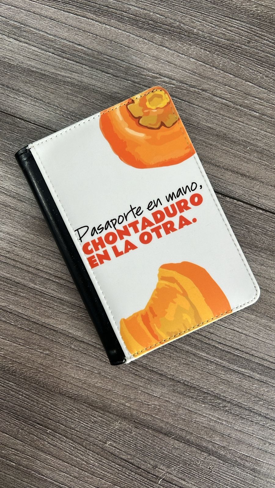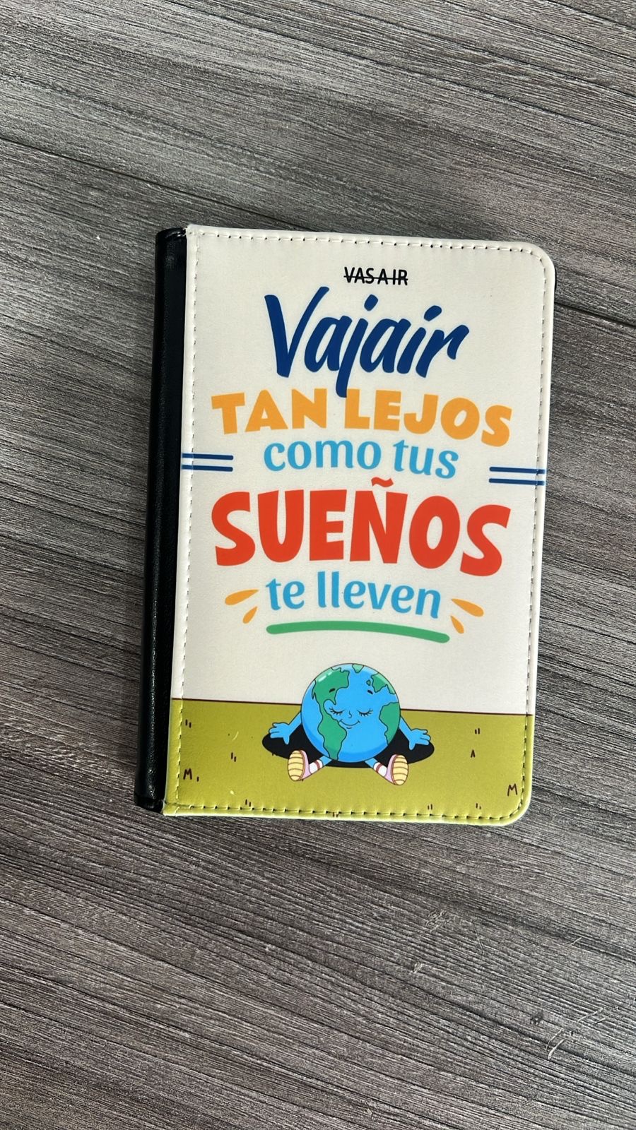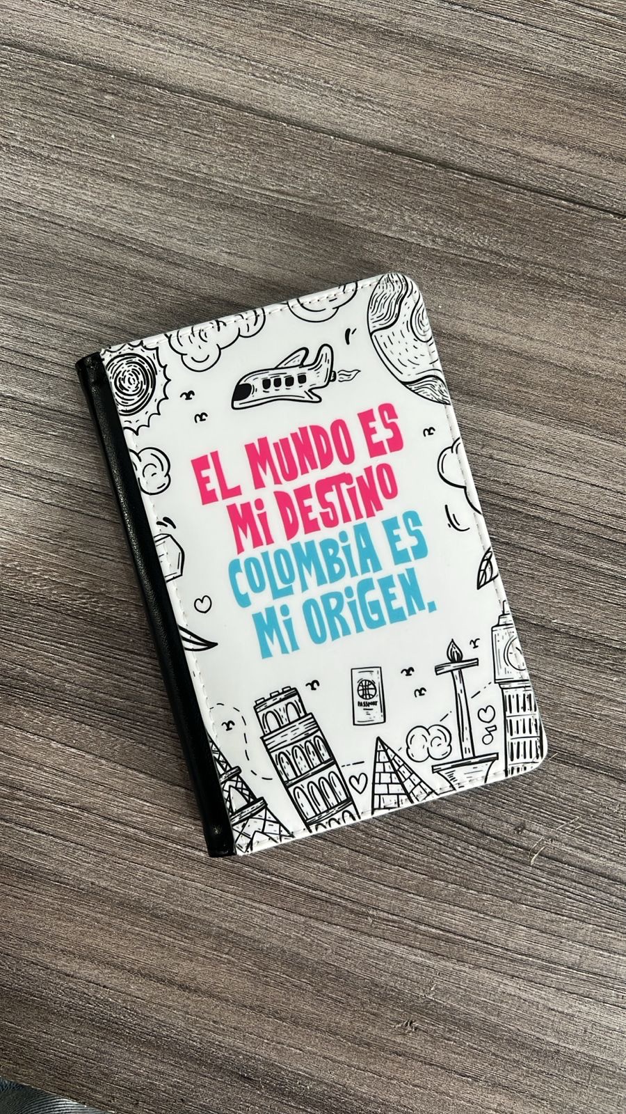 Portapasaporte en cuerina y resorte, con compartimientos internos para pasaporte y otros documentos.